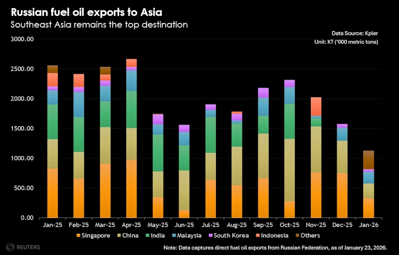 Russian fuel oil exports to Asia have totalled about 1.2 million metric tons (about 246,000 barrels per day) so far in January and are on track to slide for a third straight month, ship-tracking data from Kpler showed on Friday. The slump comes as some cargoes are diverted to storage facilities before re-exporting and compares with 2.5 million tons of exports in January 2025.
